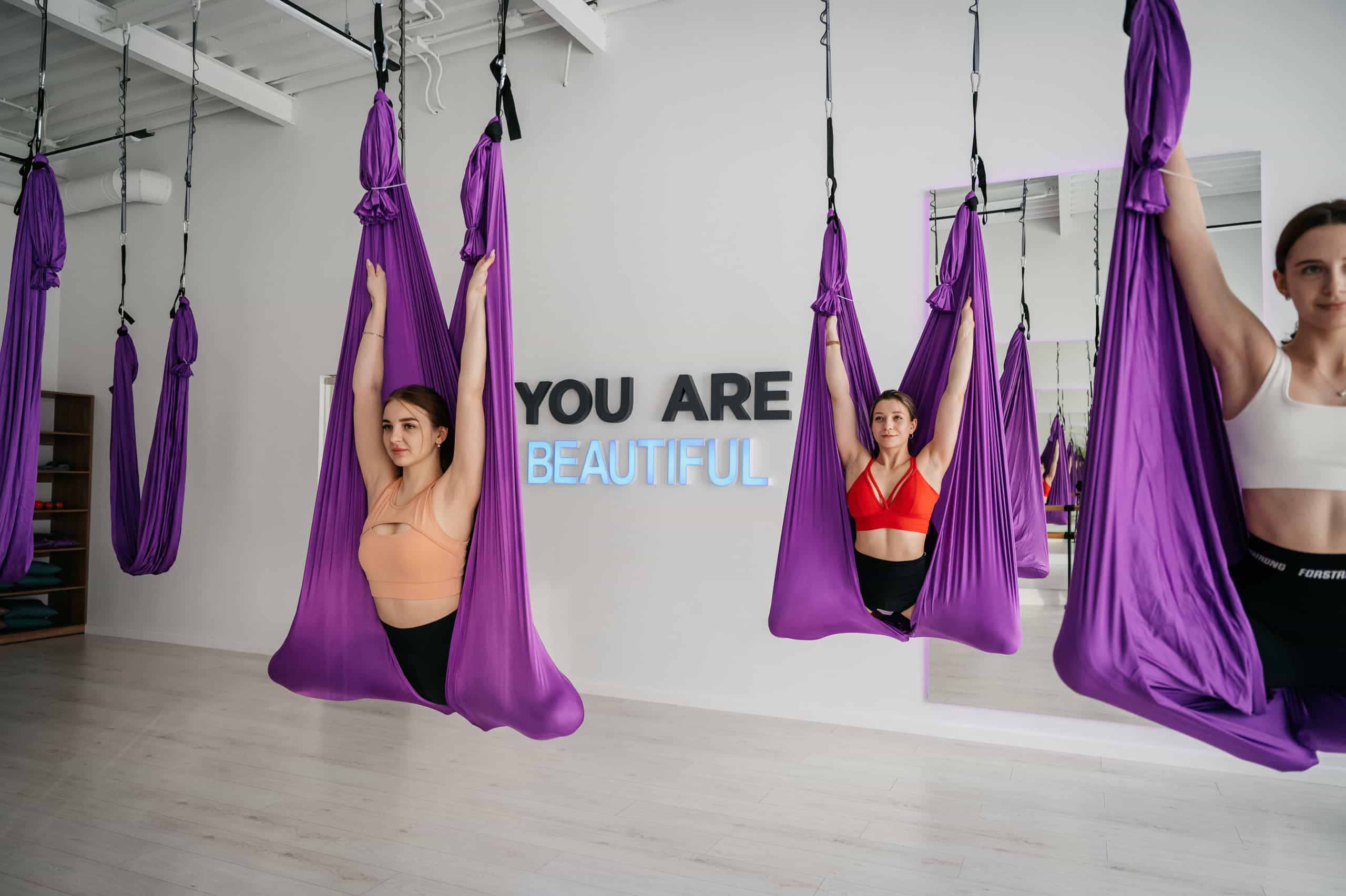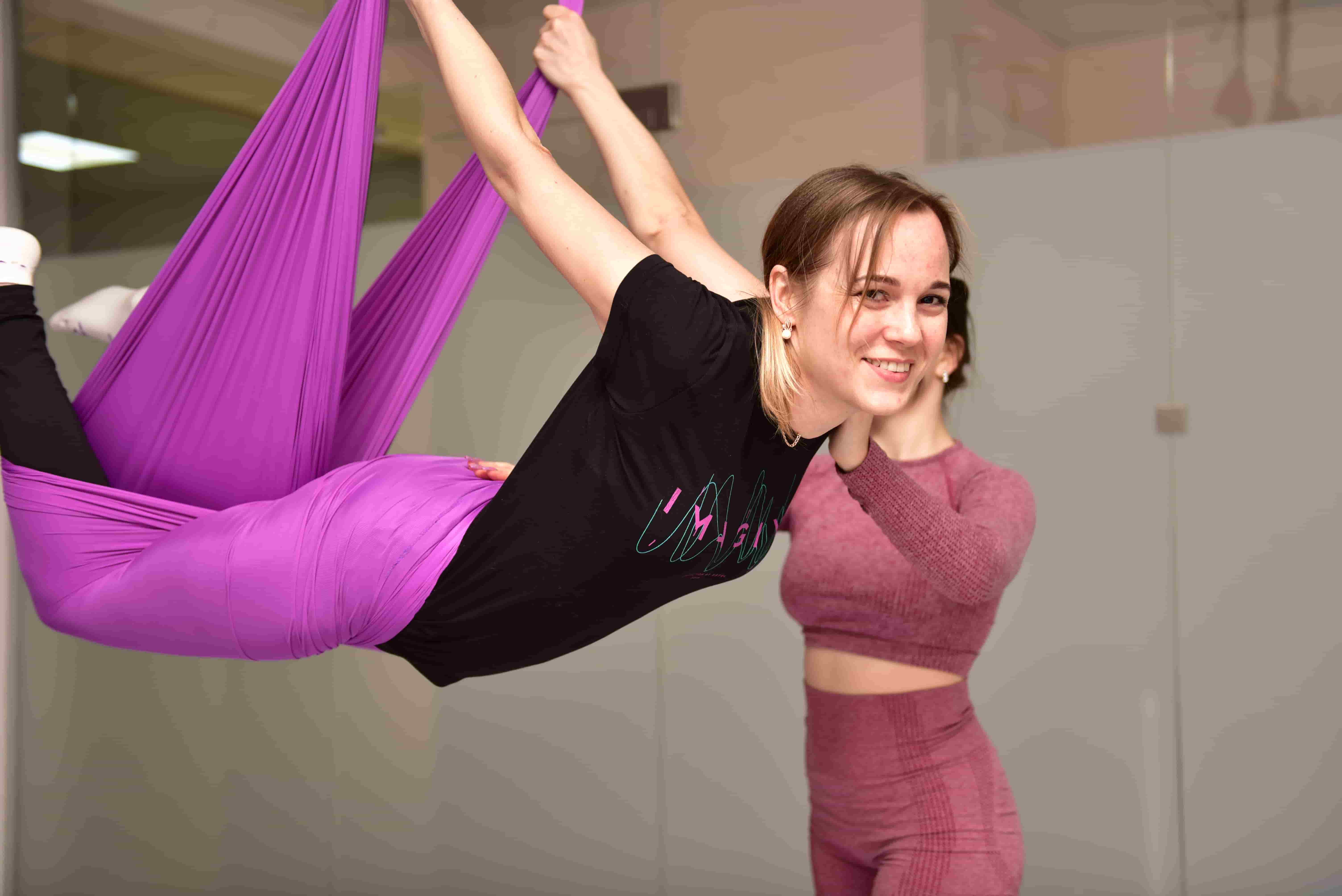Это тренировка на подвесных полотнах в виде гамака, включает в себя элементы воздушной гимнастики и йоги.